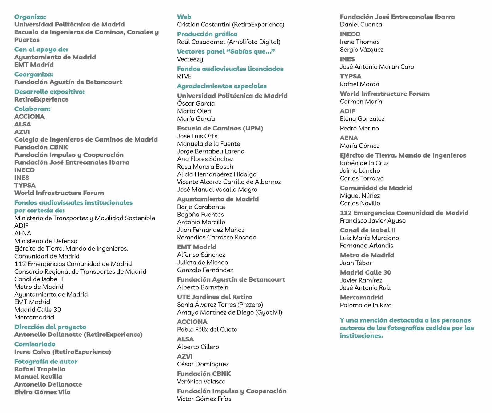 La Escuela de Ingenieros de Caminos, Canales y Puertos de la Universidad Politécnica de Madrid quiere hacer constar su más sincero agradecimiento a todas las personas e instituciones que han hecho posible esta exposición.